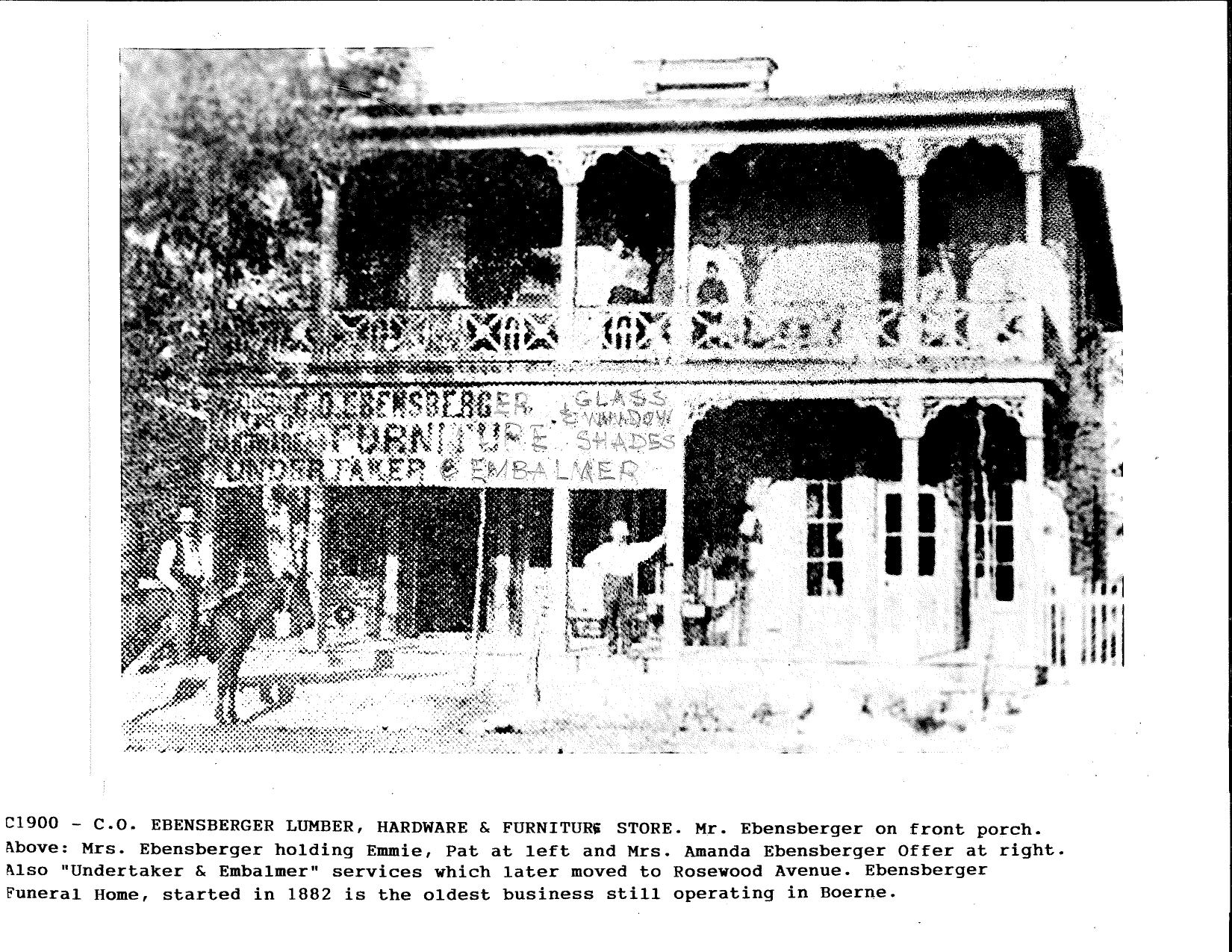Ebensberger-Fisher Funeral Home is the oldest, continuous business in Boerne since its inception in 1882. The Ebensberger family and the funeral home business are intertwined with the history and growth of Boerne. The funeral home has been in business 130 years as of May 20, 2012.